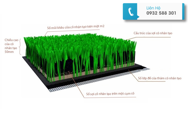 – Lớp sợi cỏ: Được làm từ chất liệu polyethylene (PE) hoặc polypropylene (PP), đây là phần quan trọng nhất tạo nên vẻ ngoài giống như cỏ tự nhiên. Sợi cỏ cao cấp thường có độ mềm mại, độ bền cao và khả năng chống tia UV.